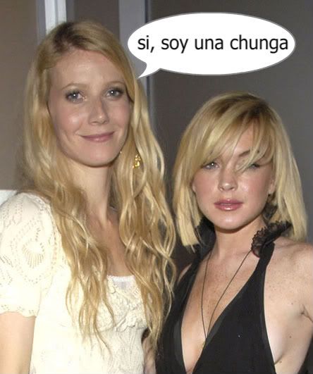 Bueno, pues la muy subnormal de Gwyneth, la mujer que le puso a su hija de nombre "Manzana" (como lo oyen) resulta que ha salido en una serie de la tele haciéndo mofa de las veces que Lindsay se ha pasado por el rehab. Y mira Gwyneth, los lectores del blog y yo sabemos que, al margen de ese aspecto de espárrago cardado y esa cara de tener bronquitis crónica que se te ha quedado de tanta lechuga (¿Por qué no le llamaste al crío "lechuga" con lo que te gusta?)eres mema. Porque eres mema y en cuanto a LiLo le den el pasaporte, vamos a ir a buscarte a la puerta de tu casa y te vamos a empotrar la edición de luxe de "Shakespeare in love", ese chiste de película por el que te dieron el Oscar porque a la presentadora se le fue la olla.
