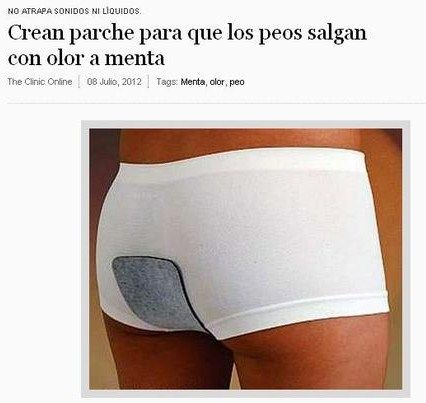 Pues bien, parece que vamos a dejar de sufrir por este nuevo invento. ¿Pedos con olor a menta? Pues parece que esto es una realidad y todo gracias al invento de unos parches que se colocan adheridos al exterior de la braga/calzoncillo de turno y entonces ustedes pueden dar ya rienda suelta a sus pasiones intestinales sin miedo a gasear a sus compañeros de trabajo o familiares. Eso sí, contra el ruido aún no han inventado nada...