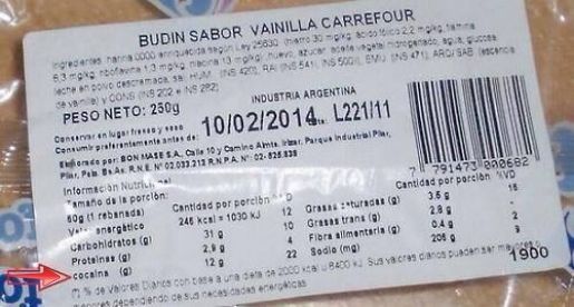 La información que alteró ayer las redes sociales y explotó en distintos portales informativos y cadenas nacionales e internacionales de noticias, figura en la etiqueta de datos nutricionales. Con vencimiento el 10 de febrero de este año y del lote 221/11, menciona los componentes: “valor energético, carbohidratos, proteínas, y cocaína”, entre otros. La palabra cocaína sólo figura en la variedad del sabor vainilla, ya que en el resto de los productos similares (budines de naranja, limón o marmolado) no aparece.