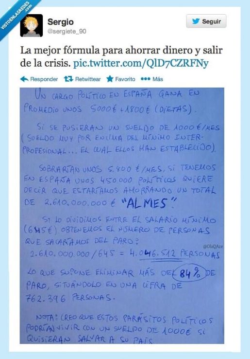 Alucinen con lo que un chico ha puesto en sus cuentas de Twitter y Facebook. ¿Podría ser este un remedio para salir de la crisis? A mi todo lo que sea quitar pasta a los políticos me parece una buena idea. Recuerden que ser político NO es obligatorio y se supone que lo hacen por vocación...