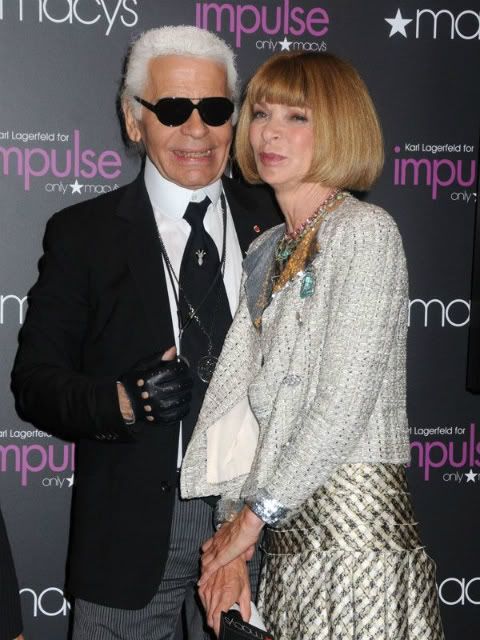 Y así va la cosa. Observen con horror esta foto de KAS LIMÓN (Karl Lagerfeld) y Anna Wintour, la jefa de Vogue USA dándolo todo en un photocall. Efectivamente, dan muchísimo miedo. Él porque uno no alcanza a comprender cómo con la millonada que gana al año por hacer la misma colección una y otra vez para Chanel no se para un rato por Corporación Dermoeléctrica y se pone unos dientes como Dios manda. Y la otra porque lleva toda la vida aterrorizando a sus trabajadores con ese corte de pelo más apropiado para Miley Cyrus que para una señora de su edad. No olviden ustedes que el papel de “zorra del infierno” de Meryl Streep en “El diablo viste de Prada” está basado en ella.