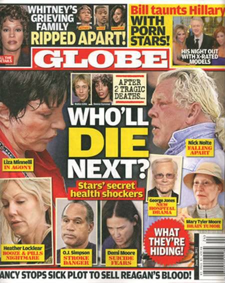 La verdad es que llevamos una temporadita que inesperadamente (o no) se nos mueren las celebrities: Whitney, Michael, Amy, Farrah, Donna... todos en muy poco tiempo. Y en Estados Unidos les ha dado una paranoia muy grande con lo exagerados que son y el tabloide GLOBE ha publicado en su portada los próximos candidatos a ser visitados por el señor de la guadaña: Liza Minelli, Nick Nolte (quién te ha visto y quién te ve), Heather Locklear o la mismísima Demi Moore por sus rumores de suicidio en la clínica esa donde ha estado desintoxicándose. Si ustedes tuviesen que apostar por el siguiente famoso que la va a cascar... ¿quién sería su candidato? Espero sus respuestas a la puerta de un tanatorio...
