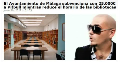 Y es que el Ayuntamiento piensa que un concierto de Pitbull está más que justificada por el gran alcance social del acto. Como lo oyen. Y todo ello a cambio de que el logo del Ayuntamiento aparezca en los posters del concierto y unas 200 entrada destinadas a "necesidades de protocolo". Mientras tanto, el mismo Ayuntamiento ha decidido recortar el horario de las bibliotecas durante los periodos de exámenes. Supongo que es una manera de decir a los jóvenes malagueños que tiene mucho más futuro hacerse rapero que estudiar medicina...¿no?